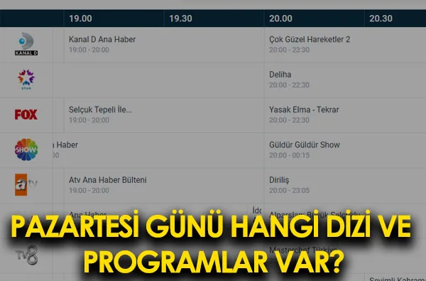 Pazartesi Günü Hangi Dizi ve Programlar Var? Tv8, Show Tv, Kanal D, TRT 1, Fox TV, Star Tv, Atv ve Kanal 7 kanallarında Pazartesi günü yayınlanan dizi ve program listesi bu sayfamızda. Pazartesi günü yayınacak programların ve dizilerin yayın saatleri için sayfamızı takip edin!